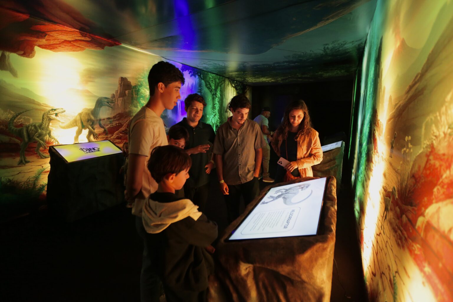 Outro ponto alto do percurso é a Arena Imersiva, uma sala com projeções nas paredes e no chão que apresenta conteúdo audiovisual exclusivo sobre o mundo jurássico. A combinação de imagens, trilha sonora e ritmo narrativo cria a sensação de estar dentro de um grande filme, tornando a experiência ainda mais impactante para o público infantil e familiar.