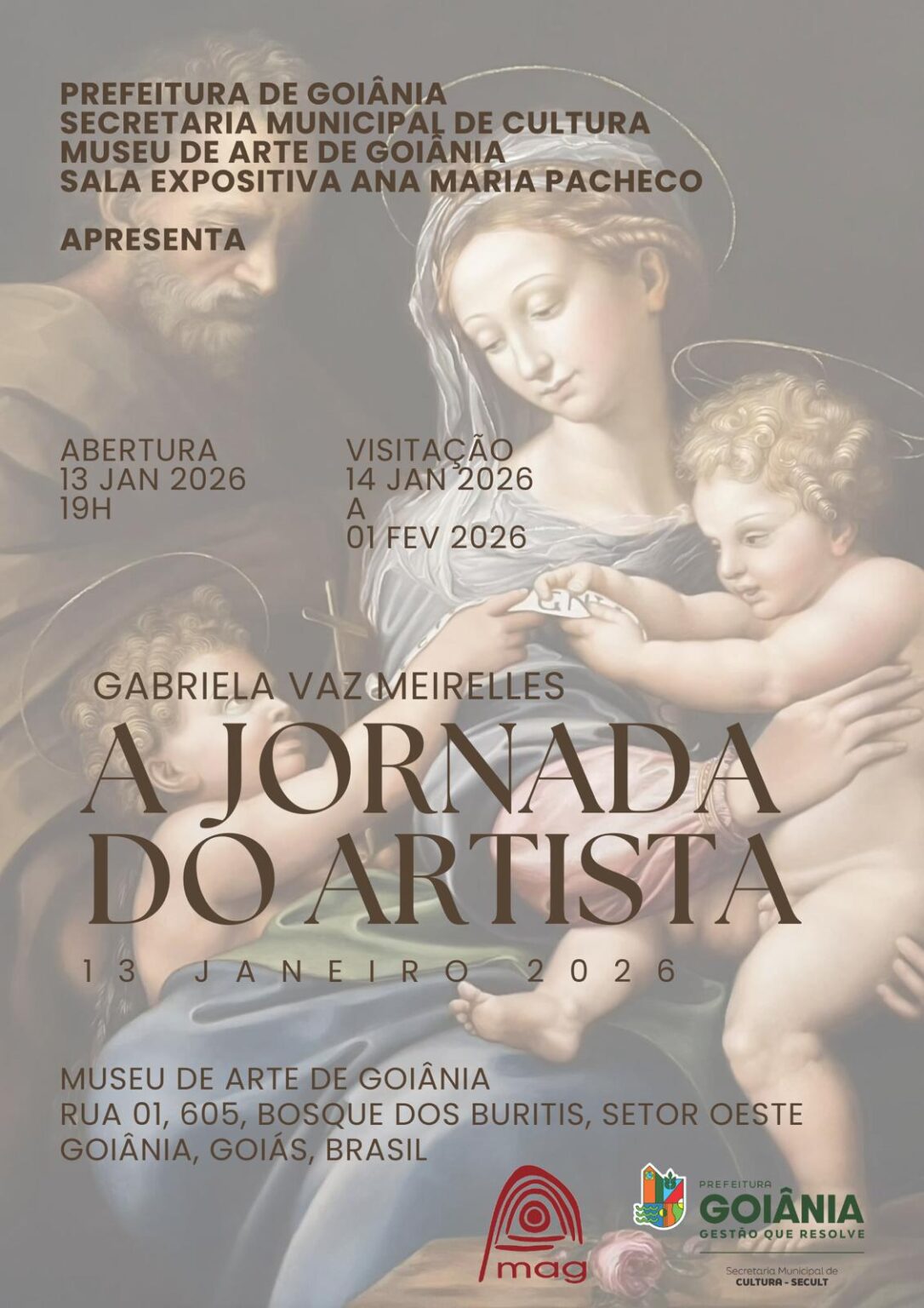 O Museu de Arte de Goiânia (MAG), unidade da Secretaria Municipal de Cultura, abre a exposição “A Jornada do Artista”, da artista visual goiana Gabriela Vaz Meirelles, ao público na próxima terça-feira (13/1), às 19h. A mostra propõe um mergulho sensível e profundo no percurso de vida e criação da artista, marcada pela busca do sentido da existência por meio da arte, da ciência e da espiritualidade.