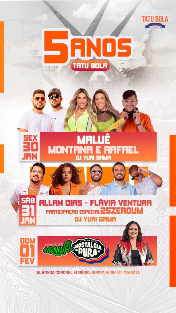 Encerrando as comemorações, o domingo (1º) será marcado pelo Ensaio de Carnaval Nostalgia Pura, comandado por Luiza Martins, em um esquenta carnavalesco que integra oficialmente a celebração de aniversário do Tatu Bola Goiânia. O projeto resgata sucessos que marcaram época e transforma o encerramento da programação em um grande encontro nostálgico.